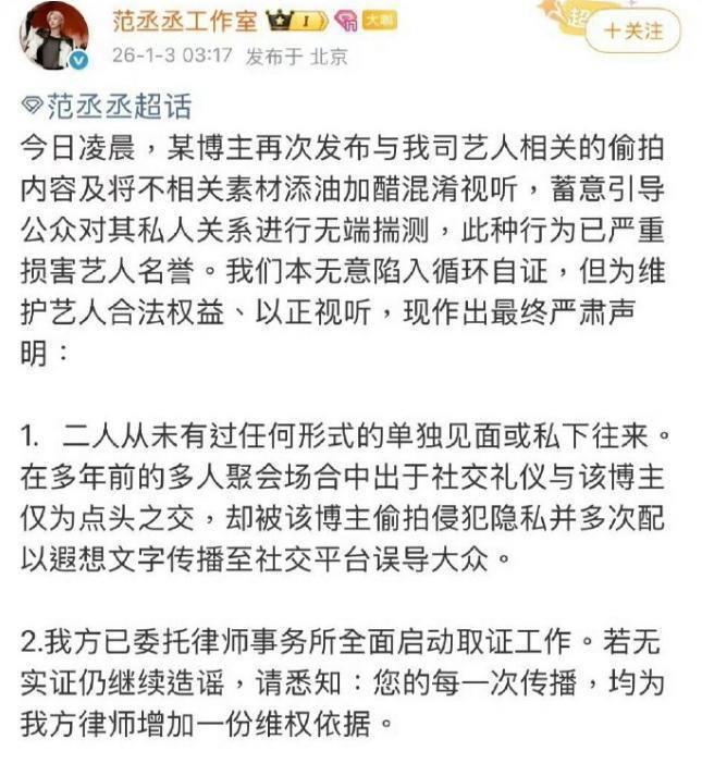 她一发这些“炸弹”似的消息没多久,相关的艺人工作室就开始连夜出来澄清,一个比一个行动快,尤其是范丞丞的工作室反应算是最快的。就在凌晨3点17分那会儿,他的工作室立马发声明,坚决否认两人私下见面,只提到多年前在一个集体聚会里算作“点头之交”。他还痛斥她偷拍隐私、用无关的素材乱添乱,加以夸大误导大众,律师已经连夜整理好证据,开始起草法律资料。鹿晗工作室虽然比别人晚了两个小时,但反而显得更坚决了些,早上5点35分和7点21分连续发出两条声明,用区块链电子存证把几十条造谣的证据固定下来。